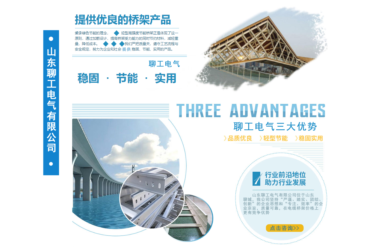 山東聊工電氣有限公司位于山東聊城,是一家銷售各類橋架的公司,公司主營鍍鋅防火噴塑橋架,鍍鋅防火電纜橋架 ,不銹鋼電纜橋架,熱浸鋅電纜橋架,鋁合金電纜橋架,熱鍍鋅電纜橋架,梯式電纜橋架等我公司堅持“嚴謹、踏實、團結、創新”的企業思想和“專注、效率”的企業宗旨,質量可靠,在電纜橋架價格上更有競爭優勢。公司追求品質,配有研發人員,進行產品的改革和創新,服務先進走出了一條富有企業特色的可持續化發展之路!    我公司鄭重向你承諾:保證最好的質量,以低的價格,完善的售后服務,來答謝新老客戶??商崆半娫捖撓怠?..